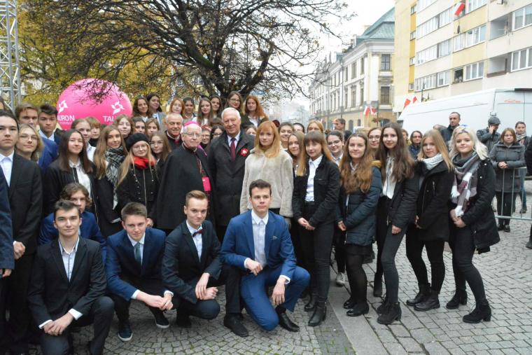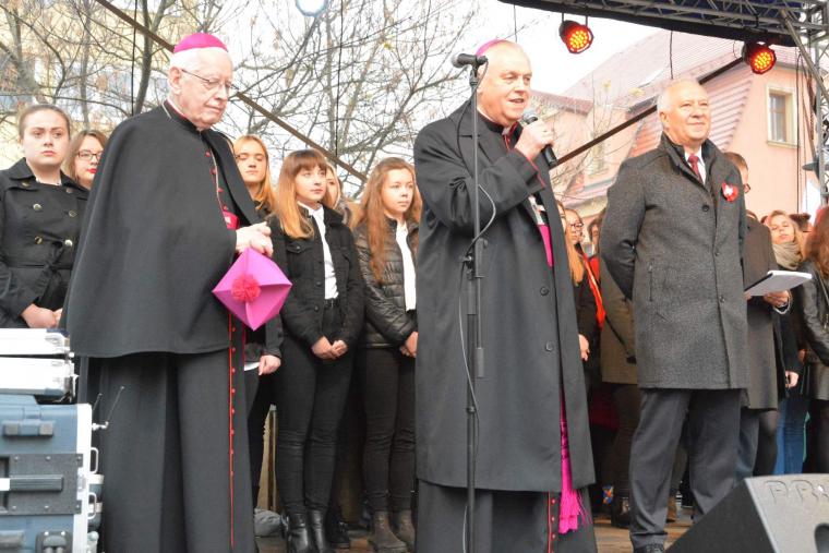 Obchody jubileuszu rozpoczęły się na legnickim rynku w południe, gdzie tłumy legniczan odśpiewały cztery zworki hymnu narodowego. Do zgromadzonych mieszkańców swoje słowo skierował biskup Kiernikowski wyjaśniając min. znaczenie słowa niepodległość.