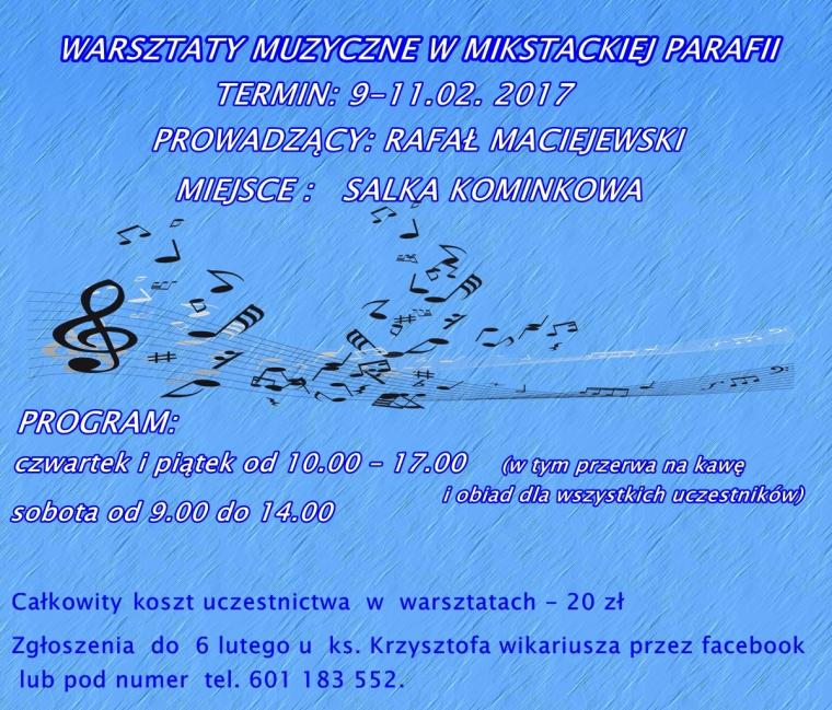 Jakie talenty zdolności można rozwijać w ten wakacyjny czas? Każde, ale na warsztaty do Mikstatu zapraszamy przede wszystkim tych, którzy muzyką i śpiewem chcą chwalić chwalić Boga. Śpiewać każdy może... trochę lepiej lub gorzej- mówią słowa piosenki. Warsztaty mają pomóc w tym, by doskonalić swoje umiejętności. Początek Warsztatów Muzycznych w Parafii Mikstat 9 lutego. Warsztaty potrwają trzy dni. W czwartek i piątek od godz. 10:00- 17:00, w sobotę od 9:00-14.00. Oczywiście przewidziana jest przerwa kawowa i obiad dla wszystkich uczestników. Warsztaty poprowadzi Rafał Maciejewski.