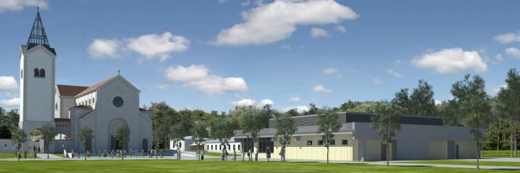 Wygląd projektowanego kościoła inspirowany jest architekturą kościołów włoskich takich jak kościoły w Asyżu: Św. Franciszka i Św. Klary, a także klasztor benedyktynów na Monte Cassino. Kościół zaprojektowano w układzie trzynawowej bazyliki z transeptem i prezbiterium. W części północnej nad kruchtą i częściowo nad nawami znajduje się chór z miejscem na organy. Obok frontu kościoła po stronie wschodniej zlokalizowano wolnostojącą wieżę dzwonnicy, która połączona jest z kościołem zabudowanym łącznikiem w poziomie chóru. Także po stronie wschodniej zaprojektowano wirydarz. Na ten wewnętrzny dziedziniec prowadzi przejście w cokole wieży dzwonnicy. Przestrzeń wirydarza jest ograniczona od strony wschodniej budynkiem plebanii i księgarni. Zamknięcie po stronie południowej i północnej stanowi mur.