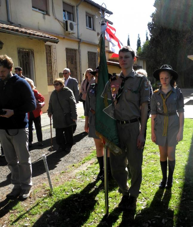 Następnie odbyła się ceremonia złożenia kwiatów pod masztem. W pierwszej parze: Pan Grzegorz Sobociński - I Radca Ambasady RP w Buenos Aires wraz z Panem Ryszardem Konopką – Prezesem Związku Polaków w Argentynie. W kolejności: Hm. Andrzej Wojno – Przewodniczący Zarządu Okręgu ZHP w Argentynie wraz z O. Jerzym Twarogiem – Rektorem Polskiej Misji Katolickiej w Argentynie. Po złożeniu kwiatów i oddaniu czci poległym – minutą ciszy, głos zabrał O. Rektor PMK. W kilku słowach wprowadził obecnych w klimat obchodów tego wyjątkowego dnia. „Dokładnie 80 lat temu, od hitlerowsko - sowieckiej napaści na Polskę na podstawie ustaleń paktu Ribbentrop - Mołotow rozpoczął się największy w historii konflikt zbrojny. Słowa „Pamięć i Przestroga” powinny być motywem przewodnim dzisiejszej rocznicy. Polacy w Argentynie pragną dziś uczcić pamięć o tych, którzy nigdy się nie poddali, poprzez uwrażliwienie młodego pokolenia na pielęgnowanie wartości i idei patriotycznych oraz zachowanie pamięci o wydarzeniach minionych, o tym jak długa, trudna i wykańczająca była wojna, która wybuchła nagle ...... 1 września 1939 r.” – powiedział O. Jerzy.