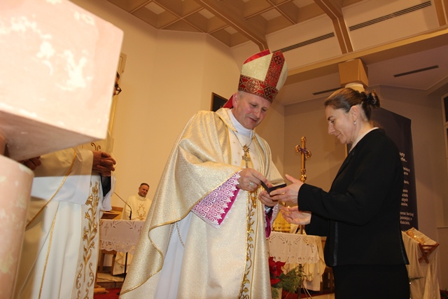 W czasie Mszy św. przyjęto do Akcji Katolickiej cztery nowe członkinie, którym biskup wręczył odznaki i legitymacje.