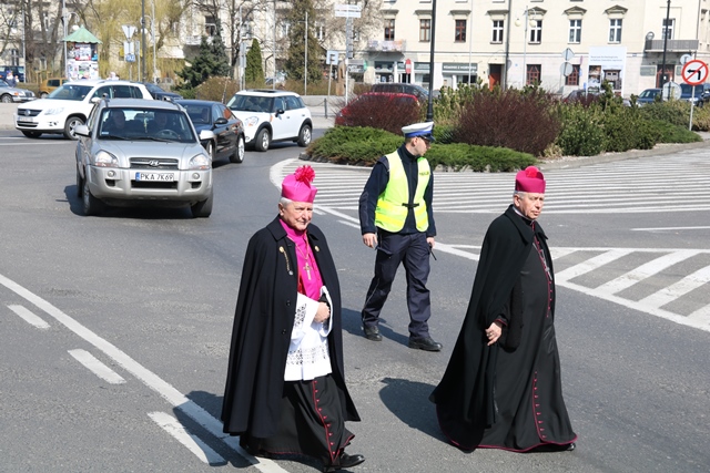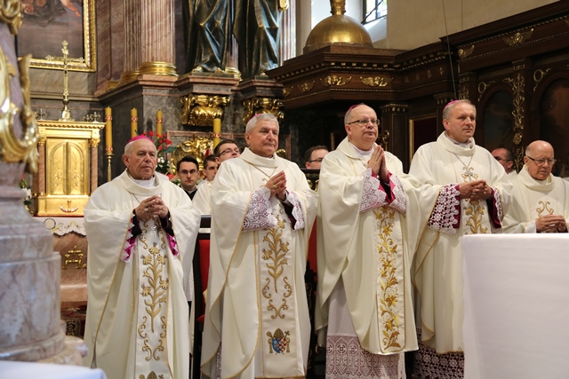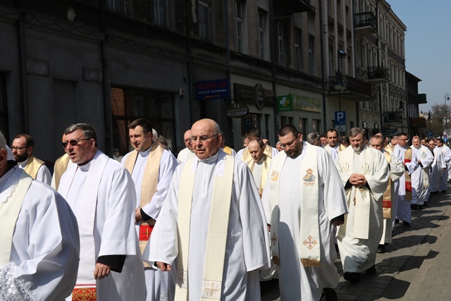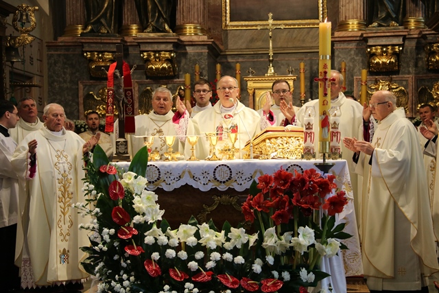 Biskupów i kapłanów powitał bp Edward Janiak. – Księże Biskupie proszę modlić się za nas, abyśmy byli bliżej Boga, byli autentycznymi świadkami Chrystusa Zmartwychwstałego. Ogarniamy naszą pamięcią kapłanów chorych na czele z ks. biskupem Teofilem i starszych, którzy łączą się z nami duchowo. Raduje się moje serce, że bazylika wypełniła się dzisiaj tak pięknie kapłanami Kościoła Kaliskiego – powiedział biskup kaliski.