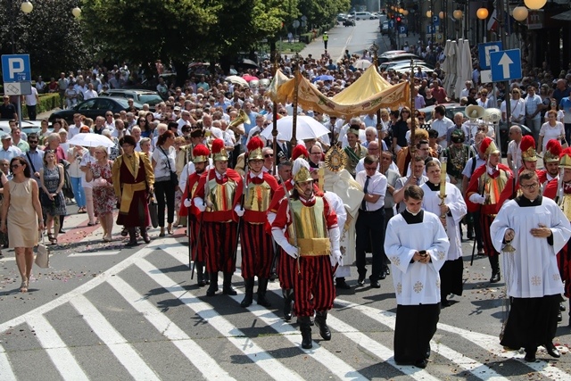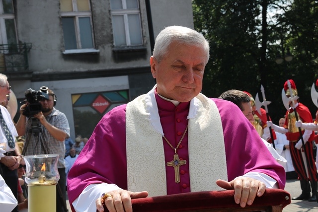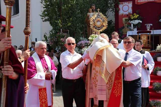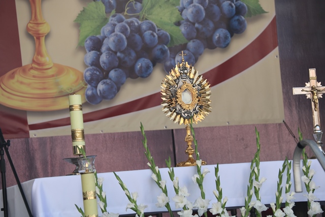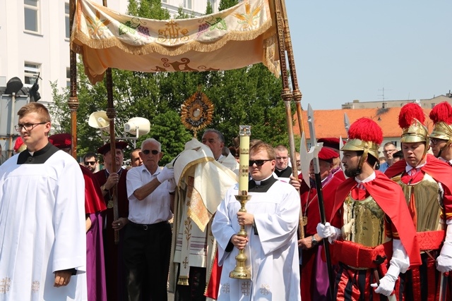 Prosił zgromadzonych, aby zaprosili do swojego życia Boga. - W to piękne święto Ciała i Krwi Pańskiej tutaj na ołtarzu składamy wszystkie troski, ale też przywary i błędy wypraszając Boże błogosławieństwo. Chciejmy Pana Boga zaprosić do naszych rodzin, do naszych serc, byśmy z mocą i siłą wytrwali w dźwiganiu codziennego krzyża, a to ziemskie pielgrzymowanie czy nam się podoba czy nie kiedyś skończy się – podkreślał kaznodzieja.