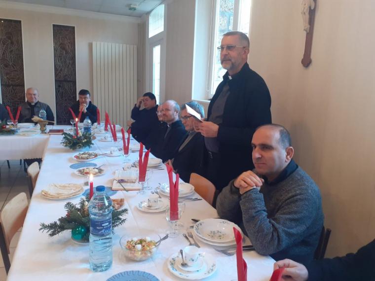 Następnie goście udali się do jadalni na wigilijny posiłek. Do uczestników kapłańskiej Wigilii, z życzeniami bożonarodzeniowymi, zwrócił się ks. Bogusław Brzyś, rektor Polskiej Misji Katolickiej we Francji, i nawiązał w nich do poprzedniego roku, gdzie świat zatrzymał się w pandemii; nie było wówczas kapłańskiej Wigilii, świąteczne życzenia składaliśmy sobie za pomocą Zooma. Ks. Rektor PMK wspominał, że był tam pewien punkt – w zeszłorocznych życzeniach – gdzie mówił kapłanom, iż kiedy panująca pandemia minie, nie będzie tego wirusa, to żebyśmy się tak łatwo nie przyzwyczaili do tego, co już było dotychczas, ale abyśmy coś nowego rozpoczęli w życiu wiary, aby ten wirus wymusił na nas nowe i świeże podejście do naszego duszpasterstwa.