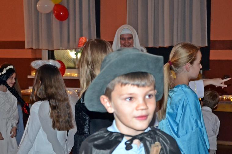 Nie zabrakło konkursów z nagrodami i słodkości. Zapewne uczestnicy Marszu i Balu Wszystkich Świętych na długo zapamiętają ten październikowy wieczór. Ponadto pokazali, że każdy może być Świętym, jeśli tylko chce … Wcielając się w postacie różnych Świętych pokazali jak różne są drogi prowadzące do świętości. Jeszcze jedna refleksja. W przededniu    uroczystości Wszystkich Świętych, gdy tak wiele osób przemieszczało się pospiesznie ulicami miasteczka robiąc jeszcze zakupy do ich uszu  popłynęło przesłanie: „możesz być świętym, jeśli chcesz”. Być może stało się one impulsem do postawienia pytania: czy naprawdę dążę do świętości?  Czy  chcę być świętym? Dla dzieci bal był zapewne okazją do poszukania takiego „ swojego” świętego, do zaprzyjaźnienia się z nim i do przeżycia wieczoru w duchu Bożej radości.