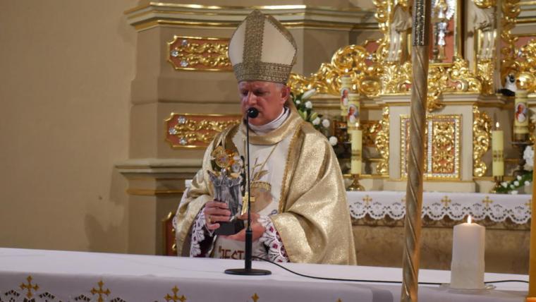 13 czerwca odbyła się w Mikstacie uroczystość przekazania przez Abpa Mieczysława Mokrzyckiego, wieloletniego osobistego sekretarza dwóch papieży, relikwii św. Jana Pawła II. Przekazując relikwie ks. proboszczowi Krzysztofowi Ordziniakowi ks. Abp powiedział: „Księże proboszczu, przyjmij tę relikwię i otaczaj ją należytą czcią i przekazuj do czczenia wiernym. Niech wszyscy modlący się przed tymi relikwiami za wstawiennictwem św. Jana Pawła II otrzymują obfitość łask i niech Go naśladują w wierze i miłości”. Następnie słowa powitania zostały wypowiedziane przez przedstawicieli parafian. Ks. proboszcz przypomniał inicjatywy podjęte w parafii, które doprowadziły do tej radosnej chwili przekazania relikwii. Podkreślił, że w znaku relikwii chcemy uczcić i powitać św. Jana Pawła II jako opiekuna i orędownika, ale także pogłębić więź modlitewną, przekazać dziedzictwo, które nam pozostawił kolejnym pokoleniom. Zwracając się do Ks. Abp Mieczysława Mokrzyckiego ks. proboszcz zaakcentował, że przybywa z dalekiego Lwowa, aby przekazać nam relikwie św. Jana Pawła II oraz wzmocnić naszą wiarę świadectwem swego życia. Następnie ks. kan. Krzysztof skierował słowa powitania do wszystkich uczestników uroczystości, dziękując tym, którzy przyczynili się do tego, że mogła się ona odbyć. Ks. proboszcz poprosił Hierarchę o przewodniczenie Eucharystii i sprawowanie jej w intencji wszystkich parafian.