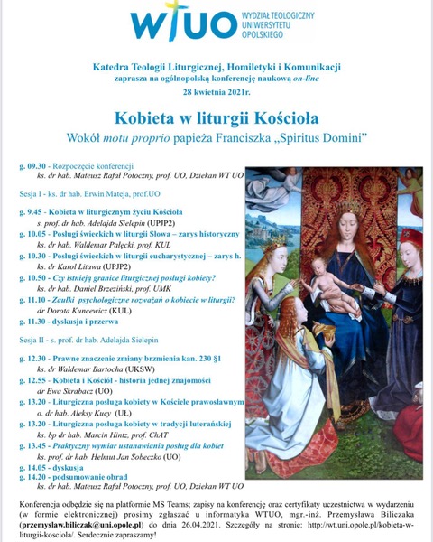 Konferencja odbędzie się na platformie MS Teams; zapisy na konferencję oraz certyfikaty uczestnictwa w wydarzeniu (w formie elektronicznej) prosimy zgłaszać u informatyka WTUO, mgr.-inż. Przemysława Biliczaka (przemyslaw.biliczak@uni.opole.pl) do dnia 26.04.2021. Do konferencji będzie można dołączyć również bez wcześniejszego zgłoszenia, jednakże ze względów organizacyjnych uprzejmie prosimy o przesyłanie informacji o planowanym uczestnictwie. Szczegóły na stronie: http://wt.uni.opole.pl/kobieta-w-liturgii-kosciola/
