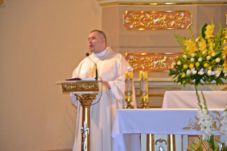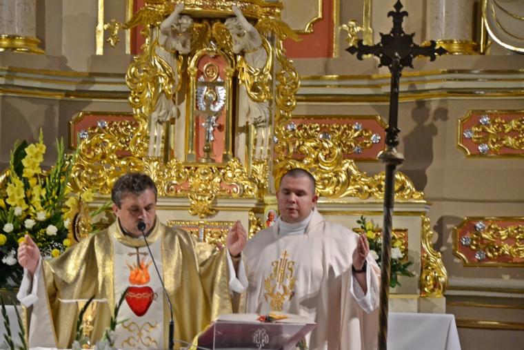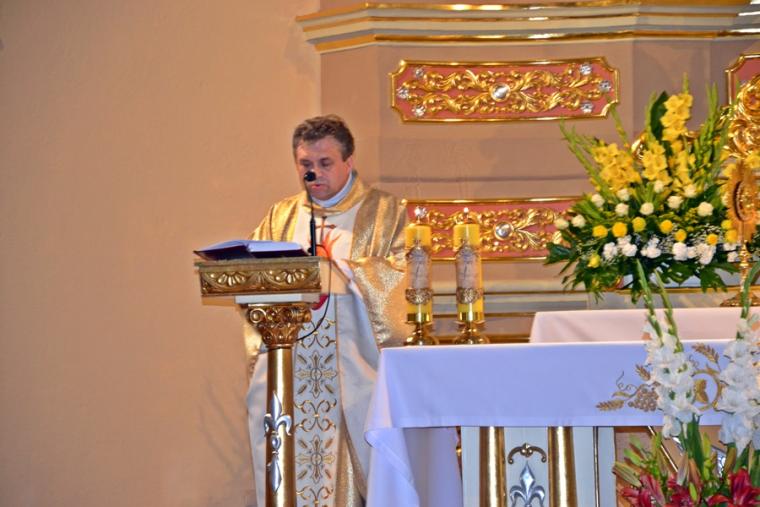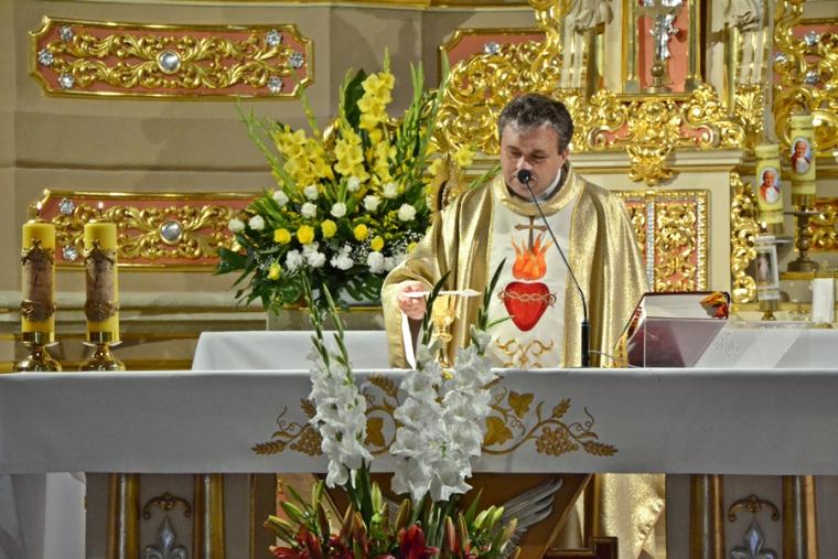Rozpoczynając homilię ks. kan. Krzysztof podkreślił, że uroczystość Najświętszego Serca Pana Jezusa została ustanowiona na życzenie Pana Jezusa  skierowane do św. Małgorzaty Marii Alacoque. Kaznodzieja przypomniał słowa św. Jana Pawła II skierowane do wiernych we Włocławku w 1991 roku: „ Jezu cichy i pokornego serca, uczyń serca nasze według serca Twego. Tak może mówić człowiek do Boga, który stał się Człowiekiem, który jako Człowiek nosi całą pełnie bóstwa i całą niezmierzoną głębie tajemnicy powołania człowieka w Bogu, w tym właśnie ludzkim sercu. Nosi tez w tym ludzkim sercu, na końcu włócznią przebitym włócznią, całą tajemnice ceny, wartości, jaką ma człowiek, całą tajemnicę odkupienia”. Kapłan zachęcał wiernych, by jak najczęściej prosili Jezusa, by uczynił ich serca na wzór Jego boskiego serca i by nie zrywali nigdy przyjaźni z Bogiem. Serca yo najważniejszy nazad ludzkiego ciała-kontynuował celebrans. Bicie serca świadczy o tym, że żyjemy. Podkreślił, że można komuś podarować serce, obdarzyć kogoś miłością. Zaakcentował, że wzorem miłości  jest dla człowieka Jezus, gdyż Jego serce zostało przebite na krzyżu za nasze grzechy. Uroczystość Najświętszego Serca Jezusowego jest okazją do dziękczynienia za wielka miłość Boga  do człowieka. W dalszej części homilii kaznodzieja wskazał  wkład  św. Małgorzaty Marii Alacoque w rozwoju kultu Serca Jezusowego. Przypomniał obietnice Jezusa Chrystusa dane za pośrednictwem św. Małgorzaty Marii Alacoque tym, którzy czcić będą Serce Najświętsze: 1.Dam im wszystkie łaski potrzebne w ich stanie. 2.Zgoda i pokój będą panowały w ich rodzinach. 3.Będę ich pocieszał we wszystkich ich utrapieniach. 4.Będę im bezpieczną ucieczką w życiu, a szczególnie przy śmierci. 5.Wyleję obfite błogosławieństwa na wszystkie ich przedsięwzięcia. 6.Grzesznicy znajdą w mym Sercu źródło nieskończonego miłosierdzia. 7.Dusze oziębłe staną się gorliwymi. 8.Dusze gorliwe dojdą szybko do doskonałości. 9.Błogosławić będę domy, w których wizerunek Serca mego będzie czczony.  10.Kapłanom dam dar kruszenia serc najbardziej zatwardziałych.  11.Osoby, które będą to nabożeństwo rozszerzały, będą miały imię swoje zapisane w mym Sercu i na zawsze w nim pozostaną. 12.Przyrzekam w nadmiarze miłosierdzia Serca mojego, że wszechmocna miłość moja, udzieli tym wszystkim, którzy przyjmą komunię św. w pierwsze piątki przez dziewięć miesięcy z rzędu, łaskę pokuty, iż nie umrą w niełasce mojej ani bez sakramentów świętych, a Serce moje będzie im pewną ucieczką w ostatniej godzinie ich życia.  Jest ich tak wiele, korzystajmy więc z bezmiaru miłości Serca Jezusowego. Czcijmy Serce Jezusowe zachęcał celebrans. Kontynuując rozważanie ks. kan. Krzysztof zaznaczył, że powinniśmy w troszczyć się o to, by nasze serca były ciche i pokorne. Jednocześnie podkreślił, że pycha stanowi poważne zagrożenie dla naszego życia duchowego, gdyż rodzi się w naszym sercu i umyśle, popycha nas do złych działań, pragnień. Celebrans apelował, byśmy często przychodzili do Jezusa, zwłaszcza gdy jest nam trudno, bo w Jego sercu znajdziemy ukojenie dla naszych dusz. Od Jezusa mamy się uczyć pokory i miłości do Boga Ojca i do człowieka- zachęcał parafian ks. proboszcz.