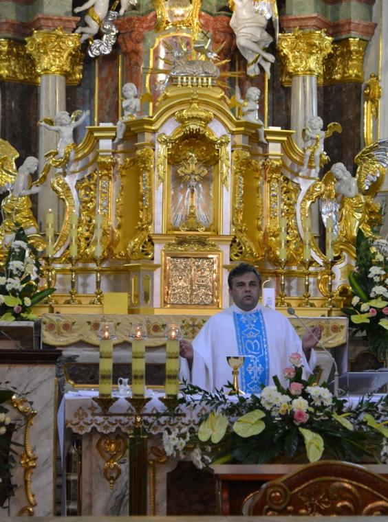 Następnie udaliśmy się na Górę Świętej Anny. Czekała tam na nas Babcia Jezusa, jej córka Maryja i Boski wnuk Jezus. Chociaż właściwie powinniśmy wymienić ich w odwrotnej kolejności, bo Anna Samotrzecia w swojej figurze pokazuje nam właśnie na Jezusa i Maryję. Ona sama stoi tuż za nimi. Po przybyciu na Górę Świętej Anny udaliśmy się do bazyliki. Stąd po przywitaniu i modlitwie udaliśmy się do Groty Lourdzkiej. Był czas na nawiedzenie kapliczek kalwaryjskich i indywidualną modlitwę w bazylice. Każdy z nas wyruszał na pielgrzymi szlak chcąc przedstawić przez wstawiennictwo świętych Bogu swoje intencje. Ważny był zatem ten czas na indywidualną modlitwę. O godzinie 14:30 w bazylice św. Anny przeżywaliśmy najważniejsze wydarzenie pielgrzymkowego dnia- Eucharystię. Sprawował ją we wszystkich naszych intencjach ks. proboszcz Krzysztof Ordziniak. Rozpoczynając mszę świętą podkreślił, że przybyliśmy na tę Górę, by uczcić świętą Annę matkę Maryi i babcię Jezusa, by jej powierzyć nasze radości i troski. W rozważaniu ks. kan. Krzysztof przypomniał, że pielgrzymowaliśmy do trzech Świętych. Nasz pielgrzymi szlak rozpoczęliśmy od Dobrzenia i spotkania ze św. Rochem, który patronuje naszemu miastu, następnie był Kamień Śląski i spotkanie ze św. Jackiem. Wreszcie dotarliśmy na Górę Świętej Anny. Podkreślił, że chronologicznie trasa naszego pielgrzymowania powinna rozpocząć się na Górze Świętej Anny. Zaznaczył, że Biblia nie przekazuje nam informacji o Annie i Joachimie, ale wiadomo, że długo oczekiwali na Maryję. Zwrócił uwagę, że podobnie było w życiu rodziców naszego niebieskiego Patrona, którzy uprosili sobie potomka właśnie za wstawiennictwem Maryi. Kontynuując ks. kanonik zaakcentował, że rodzice Maryi musieli być ludźmi świętymi, skoro przekazali życie tej, która zrodziła Zbawiciela. Podkreślił, że Maryja była służebnicą Pańską, tą, która potrafiła bezgranicznie zaufać Bogu. Zapewne tego zaufania uczyła się w domu, od swoich rodziców. Kaznodzieja zwrócił uwagę, że św. Anna jest tą, która uczy nas zaufania. Zachęcił, byśmy będąc w tym szczególnym miejscu prosili o umiejętność zaufania Bogu. W dalszej części rozważania ks. kan. Krzysztof prosił św. Annę, by w sposób szczególny wspierała tych, którzy są babciami i dziadkami, od których wiele zależy. Podkreślił jednocześnie, że ich rola we współczesnym świecie jest trudna, gdyż młodzi nie zawsze chcą przyjmować ich wskazania. Celebrans zwrócił uwagę na znaczenie modlitwy. Kończąc przywołał słowa pieśni śpiewanej często w sanktuarium: „Niech się co chce ze mną dzieje, w Tobie święta Anno, mam nadzieję”. Są one, jak podkreślił, wyrazem naszego zaufania do św. Anny. Przed końcowym błogosławieństwem ks. kan. Krzysztof odmówił modlitwę pielgrzyma przez wstawiennictwo św. Anny.