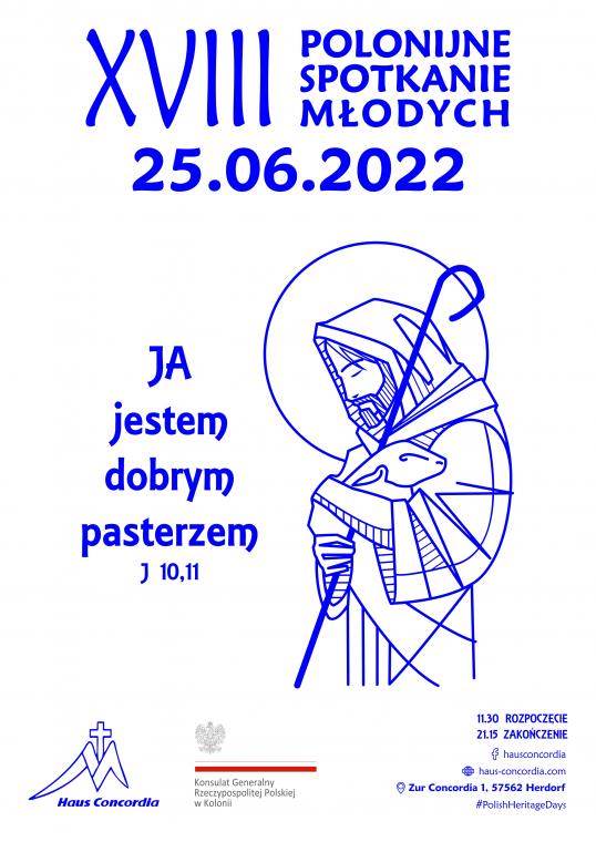 Zapraszamy młodzież polonijną oraz wszystkich, którzy mają i czują w sobie młodego ducha - na wielkie święto młodości do Concordii w dniu 25 czerwca 2022 roku. Spotkanie odbędzie się pod hasłem: "Ja jestem dobrym pasterzem" J 10,11 Czekamy na Twoją obecność!!!