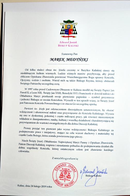 Trudno wymienić wszelkie formy aktywności Pana Marka w naszej wspólnocie parafialnej. Ksiądz. proboszcz wystosował  prośbę do ks. bpa Edwarda Janiaka o nadanie długoletniemu organiście,  kapelmistrzowi Panu Markowi Medyńskiemu odznaczenia diecezjalnego pierścienia św. Józefa. Ks. biskup przychylił się do tej prośby i podczas mszy św. dziękczynnej ks. proboszcz  przekazał srebrny pierścień Panu Markowi. W piśmie skierowanym do odznaczonego czytamy: „ Proszę przyjąć ten pierścień jako wyraz wdzięczności Biskupa Kaliskiego za podejmowane pracy i inicjatywy, mające na celu wzrost duchowy i materialny tej cząstki Ludu Bożego, która została powierzona jego pieczy”.