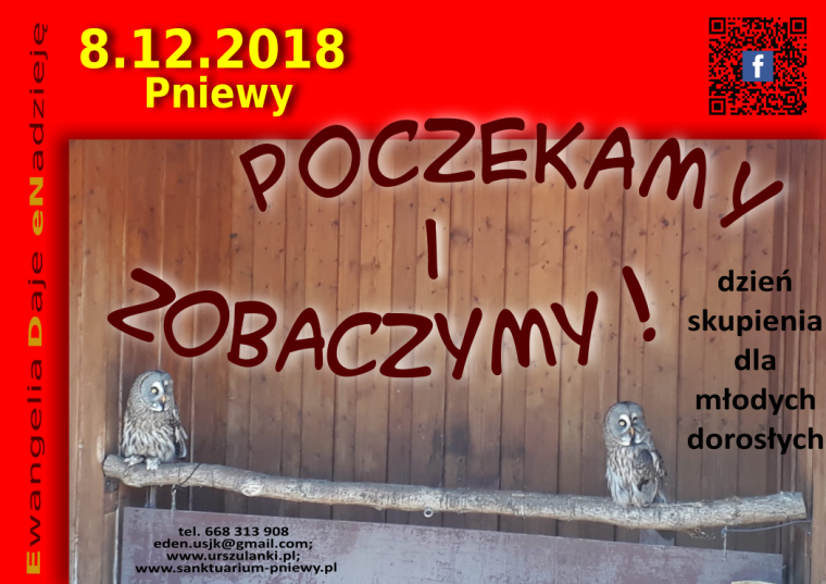 Coś, co zmienia cały świat i nieustannie przyciąga nasz wzrok. I co przeobraża nasz wzrok… Serdecznie zapraszamy młodych dorosłych (w wieku 18-30 lat) na kolejny – już adwentowy – dzień skupienia do Pniew, 8 grudnia 2018 roku (w sobotę) Sanktuarium św. Urszuli Ledóchowskiej w Pniewach. W programie m.in. cisza, modlitwa, Eucharystia, grupa dzielenia, spacer, "kawa ze św. Urszulą".