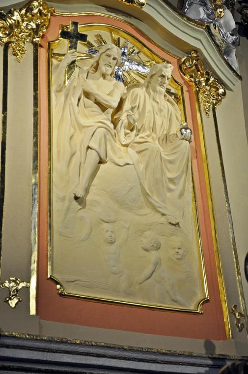 Po zakończonej Mszy Świętej, przy wystawionym Najświętszym Sakramencie zostało odprawione nabożeństwo ku czci Trójcy Świętej. Rozpoczęła je modlitwa nowennowa. To drugi miesiąc naszego trwania na Nowennie do Trójcy Świętej. Następnie odmówiona została Koronka. Ku niebu wraz z wonią kadzidła popłynęło wołanie: „Święty, Święty, Święty Pan Bóg zastępów. Pełne są niebiosa i ziemia chwały Twojej” na uwielbienie Trójcy Świętej, Ojca, Syn, Ducha Świętego. Była także okazja do tego, by w ciszy swego serca wypowiedzieć dziękczynienie. Po Koronce do Trójcy Przenajświętszej odmówiliśmy litanię. Błogosławieństwo Najświętszym Sakramentem zakończyło nabożeństwo. O zbliżających się obchodach przypomina nam baner umieszczony nad bramą wejściową do świątyni.