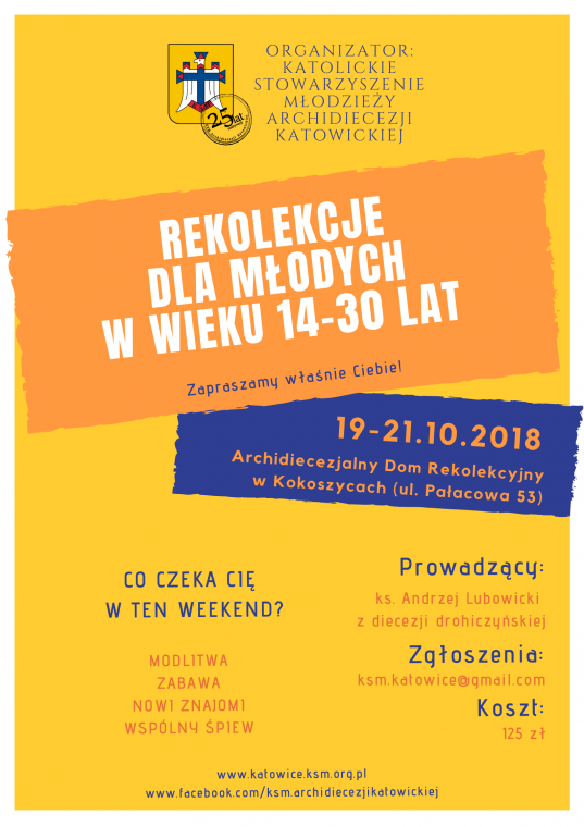 Rekolekcje odbędą się w weekend 19-21.10 w Archidiecezjalnym Domu Rekolekcyjnym w Kokoszycach (ul. Pałacowa 53). Poprowadzi je ks. dr Andrzej Lubowicki z diecezji drohiczyńskiej, pracujący na co dzień z młodymi zrzeszonymi w Katolickim Stowarzyszeniu Młodzieży. Zgłoszenie należy przesłać na ksm.katowice@gmail.com. Ze względu na ograniczoną liczbę miejsc, decyduje kolejność zgłoszeń – każda osoba otrzyma odpowiedź na wysłanego maila. Koszt rekolekcji to 125 zł (pełne wyżywienie, łóżko z pościelą, ręczniki).