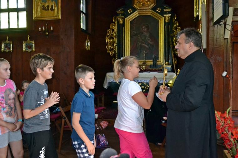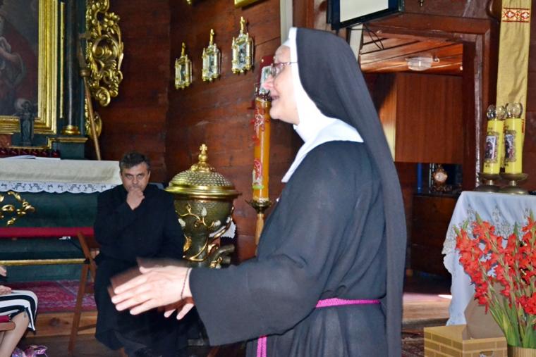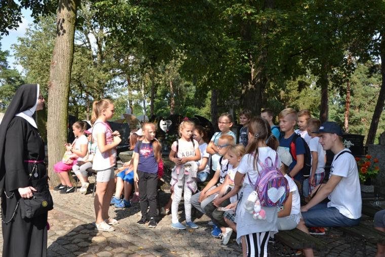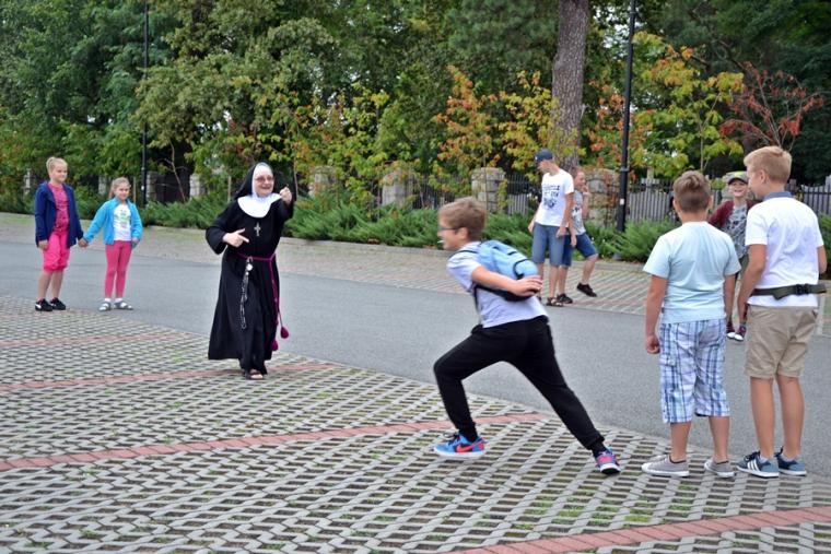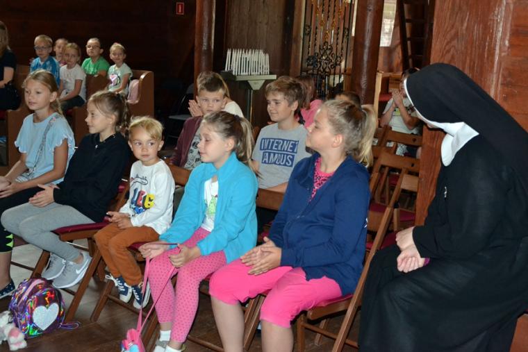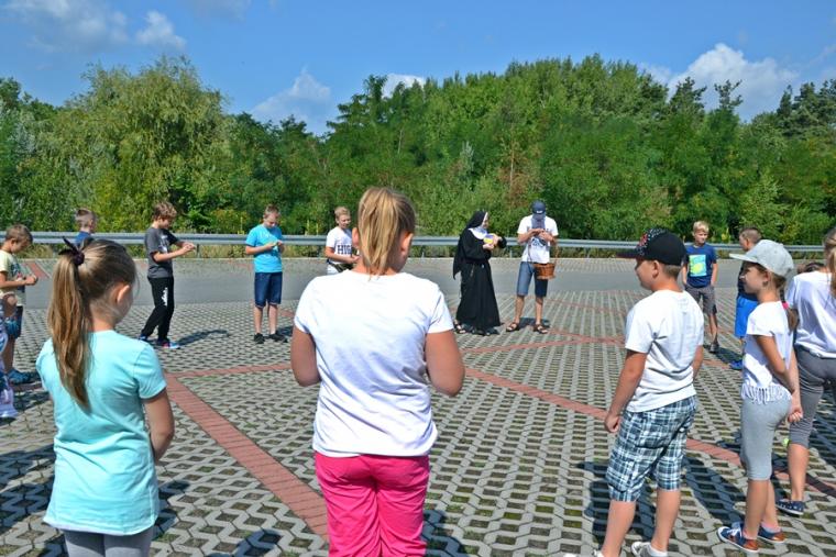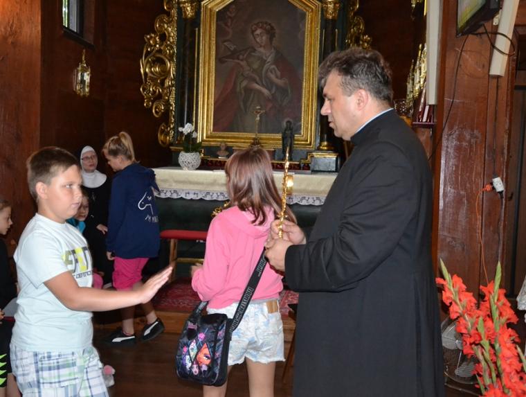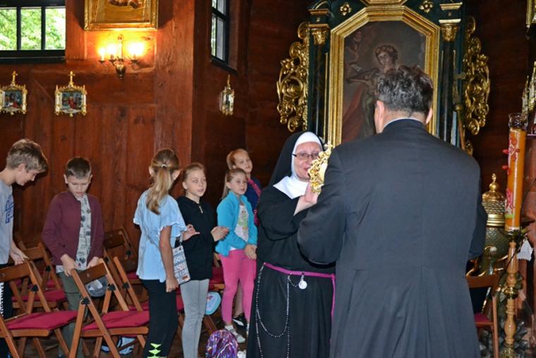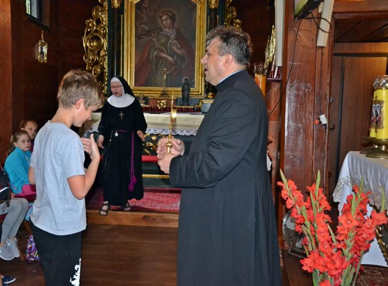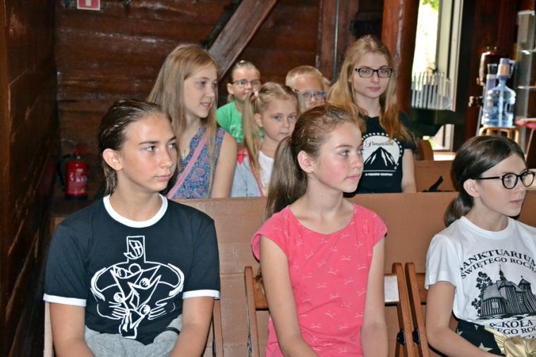 Jak okazało się w drugim dniu spotkań, dzieci sumiennie wykonały pracę domową. Było jeszcze jedno zadanie, gdyż w trakcie tegorocznej Szkoły pojawił się kufer dziedzictwa. Podczas poszczególnych dni dzieci będą wkładały do niego  rysunki, fotografie, opisy, tego co składa się na nasze dziedzictwo kulturowe. Na początek dzieci miały przyjrzeć się dziedzictwu należącemu do nich. Kufer w czwartkowe przedpołudnie zaczął się wypełniać. W tym drugim dniu w Rochowej Szkole był oczywiście czas na modlitwę nowennową podczas której ks. kan. Krzysztof odczytywał przyniesione przez młodych intencje. Potem dzieci uczciły relikwie św. Rocha.  Po modlitwie przyszedł czas na wspólny śpiew. W jego prowadzeniu niezastąpiona okazała się s. Małgorzata, która pewnie już do końca spotkań w Rochowej Szkole będzie dbała o to, by rozśpiewać dzieci,  a także organizować  dla nich zabawy ruchowe.Ta wakacyjna  szkoła została zorganizowana m.in. po to, by dzieci poznały życie św. Rocha, a także wartości, którymi kierował się On  w swoim życiu. W tym celu ksiądz kustosz wykorzystał fragment programu „Ziarno” poświęconego św. Rochowi. Dodajmy, że fragmenty tego programu były realizowane na terenie naszej parafii. Uczestniczyli  w nim młodzi Mikstaczanie.  W drugim dniu omówione zostały atrybuty, z którymi na obrazach i rzeźbach przedstawiany jest św. Roch. Stało  się to impulsem do wskazania podobieństw i różnic w  ikonograficznych przedstawieniach  św. Rocha i św. Jakuba. Podczas spotkania dzieci obejrzały film animowany „N- jak niewidomy”, w którym mogły zobaczyć w jaki sposób można pomagać osobom niewidomym bądź niedowidzącym. Ksiądz kustosz omawiając strój św. Rocha  zwrócił  uwagę na laskę pielgrzymią. Z filmu dzieci dowiedziały się, że biała laska  może być bardzo pomocna dla osoby niewidomej.  Nie zabrakło także opowieści o psach przewodnikach osób niewidomych. Film był forma przygotowania do spotkania z gościem, który tego dnia odwiedził uczestników Szkoły Świętego Rocha. Mamy nadzieję, że spotkanie to na długo pozostanie w ich pamięci. Kim był ten niezwykły gość? Otóż na spotkanie z młodymi przybyła Pani Gabriela Przygoda. Pani Gabriela jest osobą niewidomą, straciła wzrok mając 20 lat. Podczas spotkania Pani Gabrysia przedstawiła się   w kilku zdaniach, a następnie bardzo chętnie odpowiadała na pytania młodych, trzeba przyznać, że było ich bardzo wiele. Młodzi pytali m.in. o to jak radzi ona sobie z czynnościami dnia codziennego takimi jak sprzątanie, gotowanie, prasowanie, mycie, poruszanie się po mieszkaniu, dobieranie kolorystyki ubrania, pakowanie walizki na  wyjazd. Pani Gabrysia podkreślała, że  pomocne są tu często zdobycze techniki. Podkreśliła, że osoby niewidome mają z reguły bardzo uporządkowane życie. Troska o ład  ułatwia im funkcjonowanie, gdyż wiedzą wtedy gdzie mogą znaleźć konkretne przedmioty. Jest jeszcze jedna rzecz,  którą należy powiedzieć o gości. Pani Gabriela została obdarowana przez Pana Boga pięknym głosem. Dane nam było posłuchać w sanktuarium pieśni Ave Maria Jasnogórska Pani. Może kiedyś uda się Pani Gabrysi wydać płytę, życzymy jej tego  z całego serca. Po licznych pytaniach zadanych przez młodych ksiądz kan. Krzysztof zapytał Panią Gabrysię co chciałaby powiedzieć młodym ludziom. Zacytujmy to przesłanie: „Żeby żyli każdym dniem, żyli tak, żeby nikt przez nich nie płakał, bo jeżeli jest się młodym nie zwraca się uwagi na to co się robi, krzywdzi się ludzi, to to wszystko potem  wraca, jeżeli się ich nie krzywdzi, a stanie  się nam krzywda to ma się pomoc z każdej strony, ale jeśli się tego nie zauważa i  tego nie robi to wtedy jest naprawdę ciężko”.