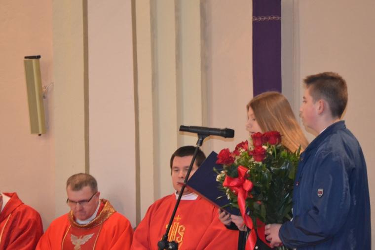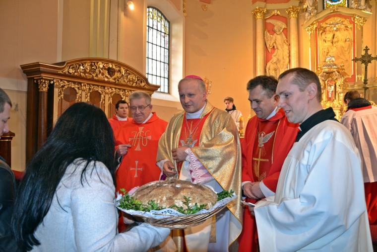 W procesji z darami młodzież przyniosła mszał, wodę i wino oraz hostie, przedstawiciele wspólnot działających  w  parafii kosz z owocami. Ponadto złożono chleb oraz grafikę przedstawiającą mikstacką farę. Podczas Mszy Świętej nie mogło zabraknąć podziękowań dla księdza biskupa za udzielenie Sakramentu Bierzmowania. Młodzi podziękowali kapłanom posługującym w naszej parafii za trud przygotowania ich do przyjęcia tak ważnego dla każdego chrześcijanina sakramentu. Słowa podziękowań popłynęły także do rodziców. Podczas tej Eucharystii ks. biskup dokonał poświęcenia odnowionej figury św. Augustyna, krucyfiksu i  trzech feretronów. Na zakończenie ks. biskup Łukasz udzielił zebranym  w mikstackim wieczerniku pasterskiego błogosławieństwa. Młodzi, którzy przyjęli Sakrament Bierzmowania otrzymali książeczki " Rozmawiaj z Bogiem. Poradnik  modlitwy". Zapewne będą one cenną pomocą w budowaniu ich relacji z Bogiem.